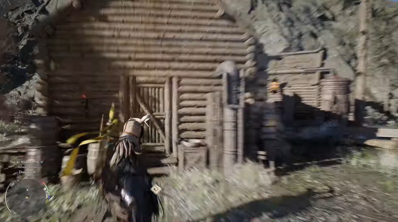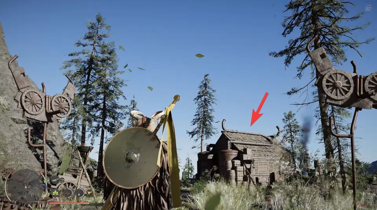 The Clockwork Cabin is located in the Hernand region, positioned near intersecting waterways as shown on your map. This structure stands out because of its mechanical design and unusual machinery surrounding it.