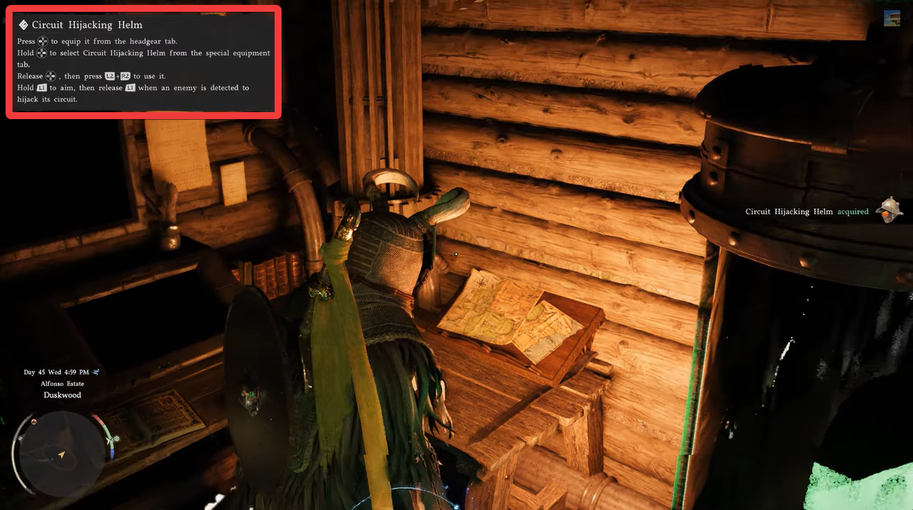Interact with the item placed on the desk to pick up the Circuit Hijacking Helm. Once collected, it will be added to your key items.