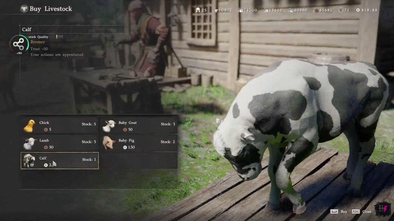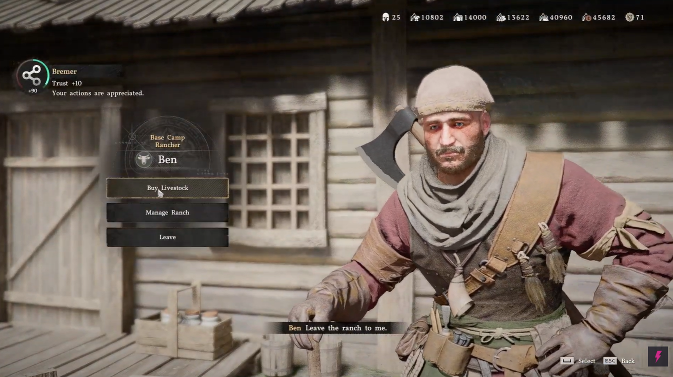 Once Bremer’s trust reaches 100, the system updates automatically, unlocking livestock options at your ranch.