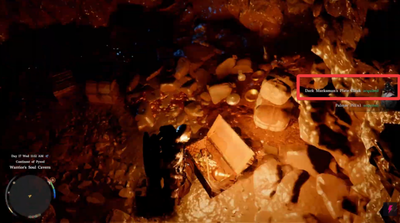 Proceed deeper into the cave and locate the treasure chest. Open it to obtain the Dark Marksman’s Plate Cloak.
