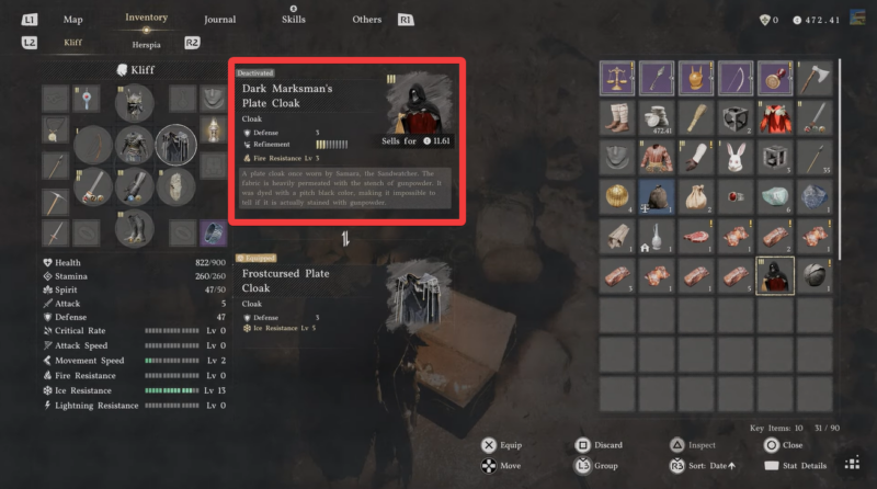 You should consider equipping the Dark Marksman’s Plate Cloak when you anticipate elemental damage rather than raw physical combat. It’s a situational piece, but in the right context, it can outperform higher-defense cloaks lacking resistances.