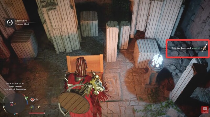 Enter the chamber and open the chest inside to obtain the Delesyian Longsword. There are no additional puzzles or enemies blocking the reward.