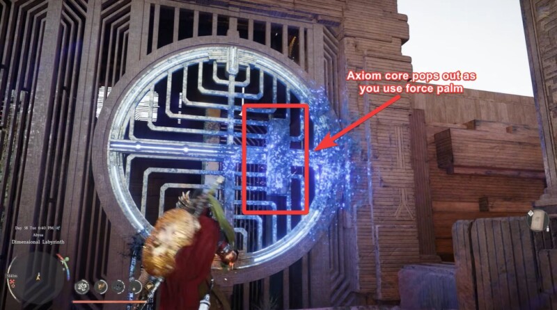 Each silver circle acts as a trigger node, and using Force Palm correctly at these nodes activates or redirects energy lines. Meanwhile, rectangular Axiom cores must be physically moved and aligned near the central Abyss Core to stabilize the system.