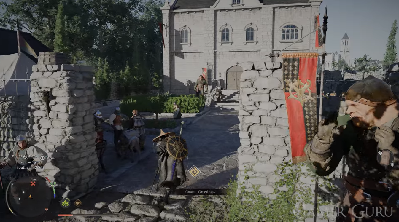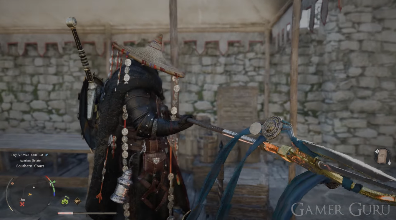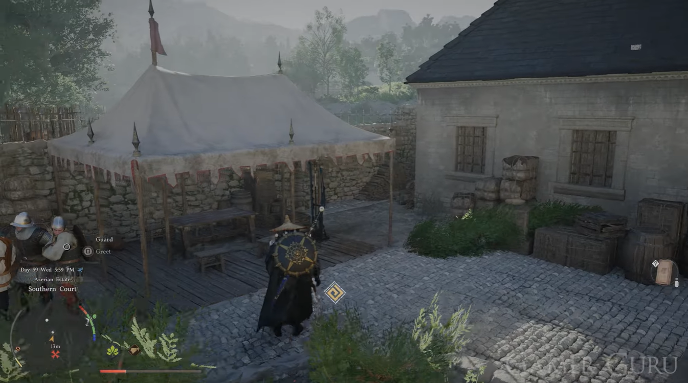 Enter through the main gate of the Southern Court. You do not need to interact with guards or proceed deeper into the building.