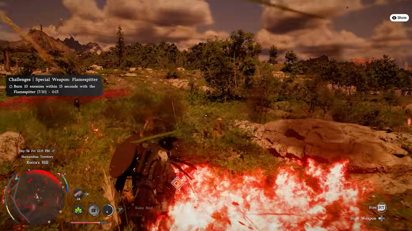 - Press the heavy attack button to release a stream of flames. This is your primary damage output and should be used when enemies are grouped or stationary.