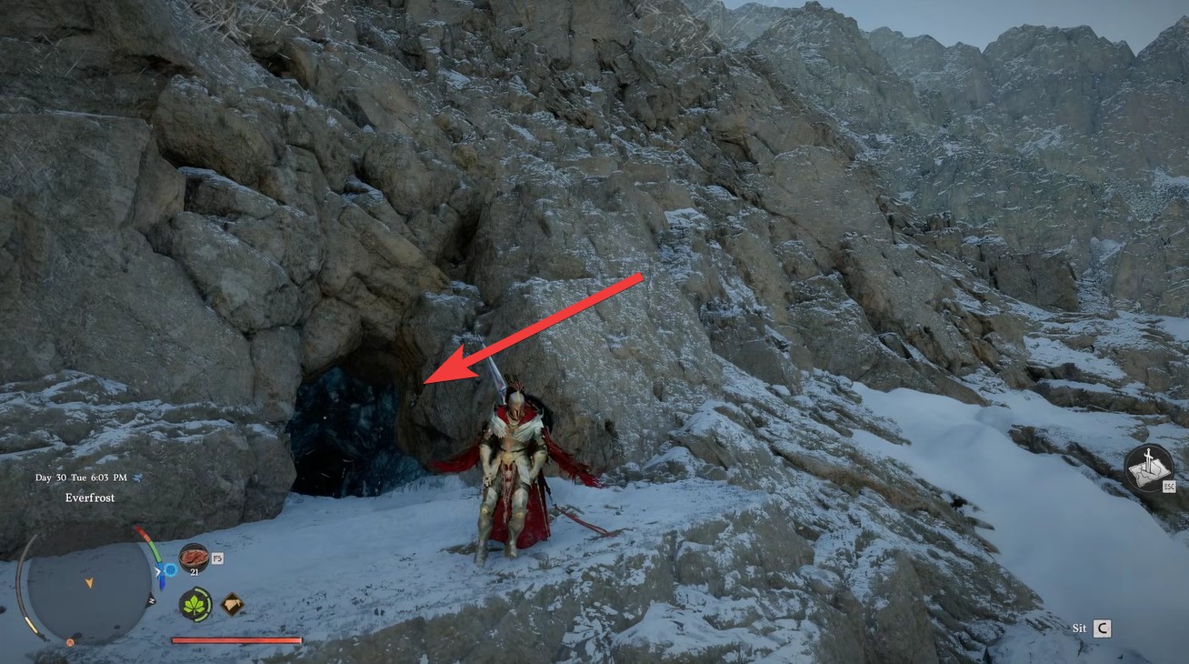 Watch for a cave entrance partially hidden within the snowy landscape. This is Everfrost Cave.