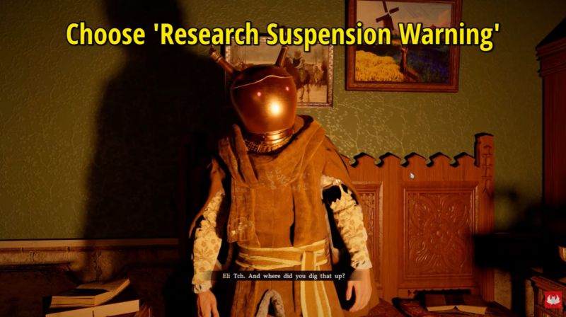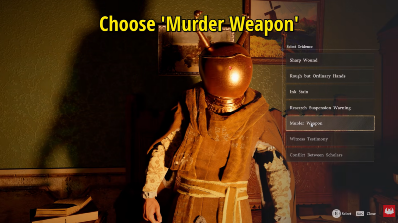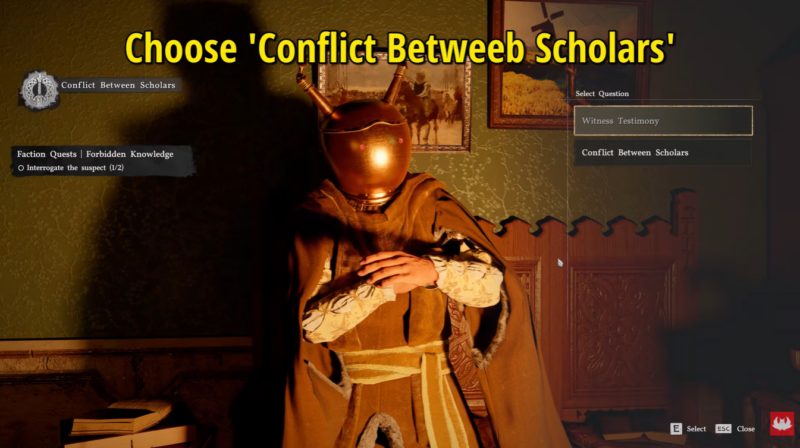 - You must interrogate two suspects: Eli and a Scholar Devotee.