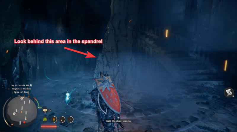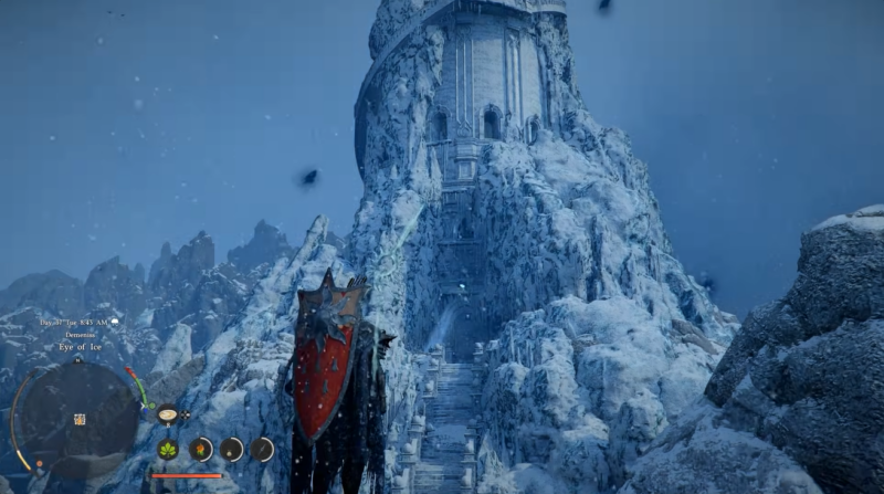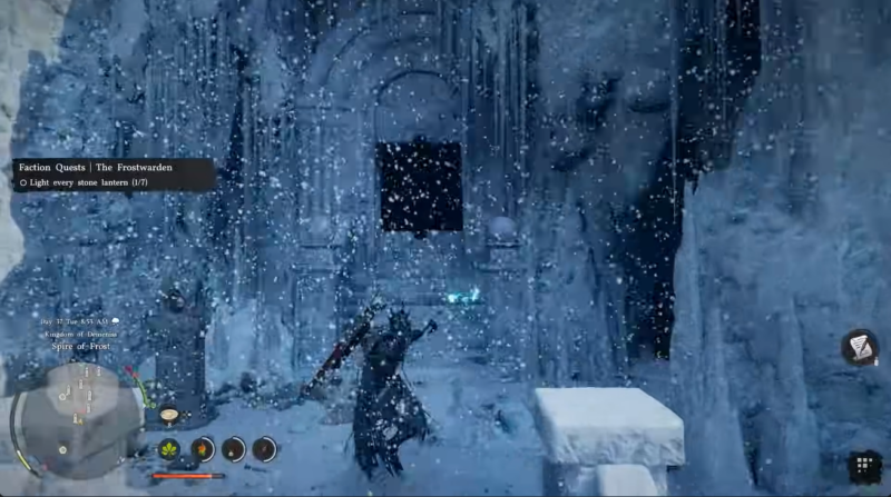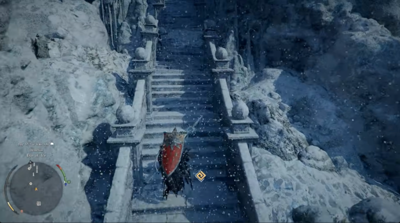 You will begin your journey at the Eye of Ice in Demeniss, a cold and visually striking region filled with frost-covered structures and ancient ruins. From here, you need to head toward the Spire of Frost located within the Kingdom of Demeniss. The structure is easy to recognize thanks to its towering icy architecture and dimly lit surroundings.