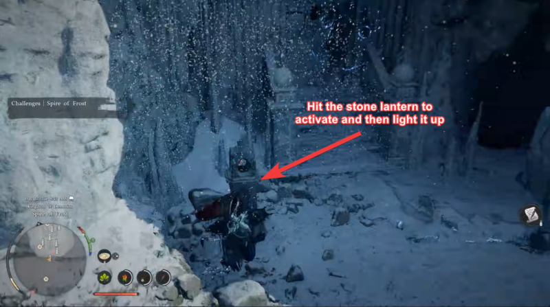 Interact with the Stone Lantern by striking it with your weapon. This triggers its activation mechanism. Immediately after, light the candle inside the lantern to complete the interaction.
