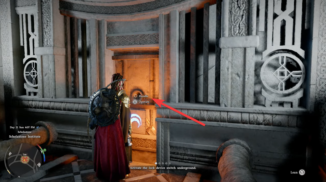 Once the puzzle is solved, locate the handle nearby and pull it. This action activates the lock device fully.