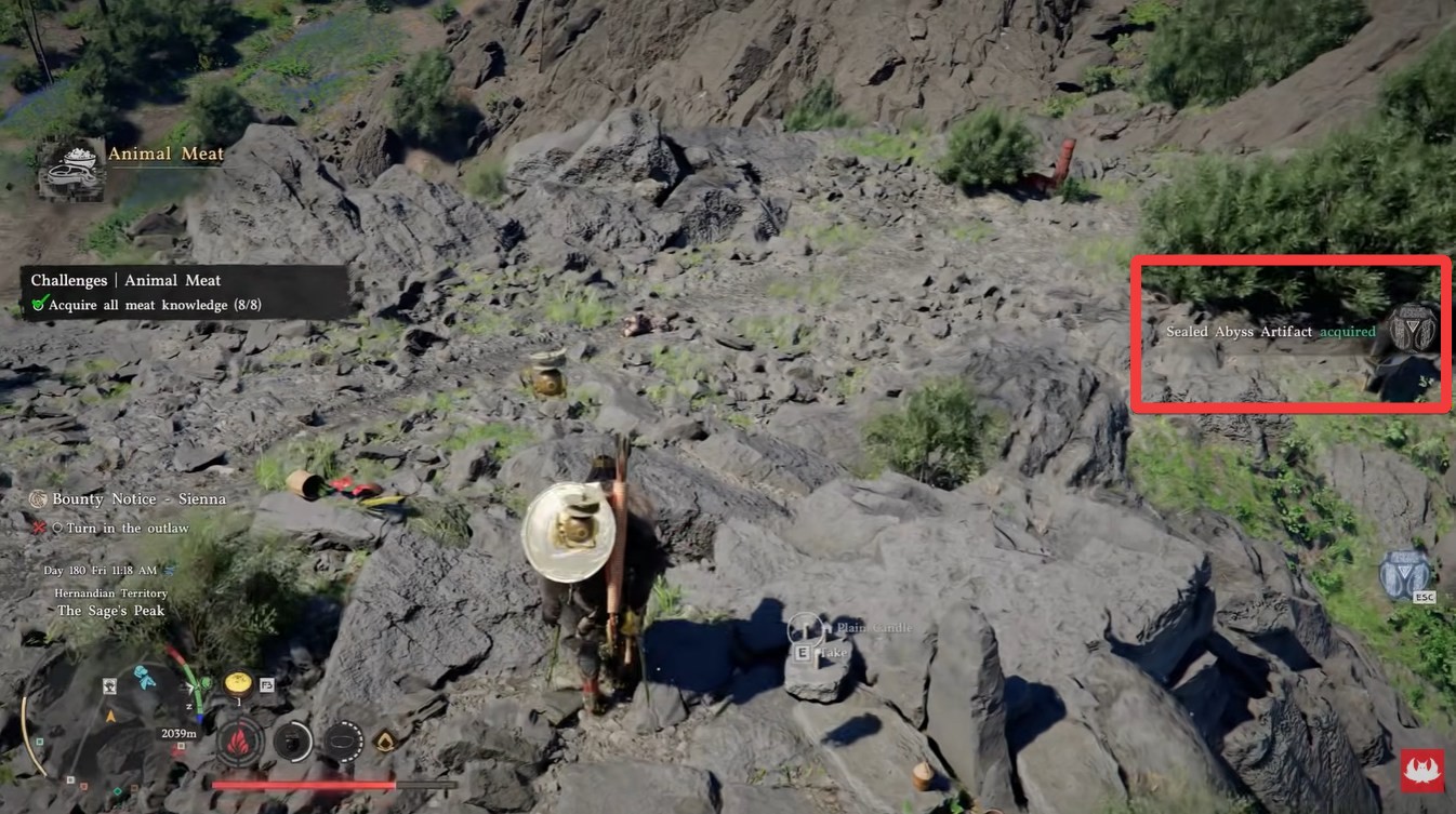 Once you interact with the artifact, it will not unlock immediately. Instead, it sets a requirement—completing the Animal Meat knowledge entries—which acts as the core challenge for obtaining this gear.