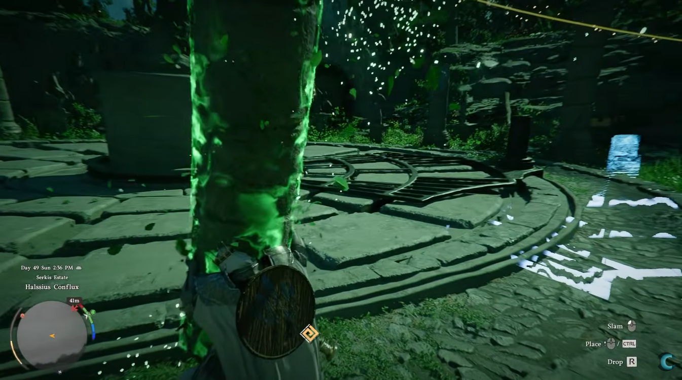 Remove the two pillars blocking the mechanism. You can either use Nature’s Grasp to lift and throw them away or simply destroy them using attacks. Once cleared, the device will begin rotating and become interactable.