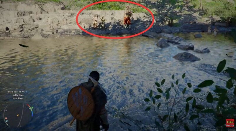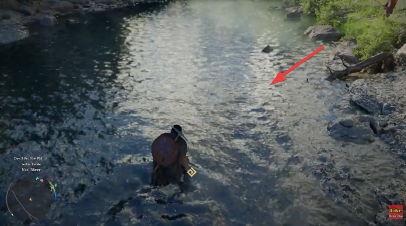 Enter the water slowly and make sure it remains shallow enough for your character to stand comfortably. Deep water won’t work for hand fishing.