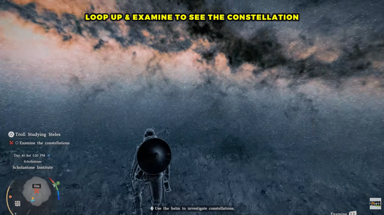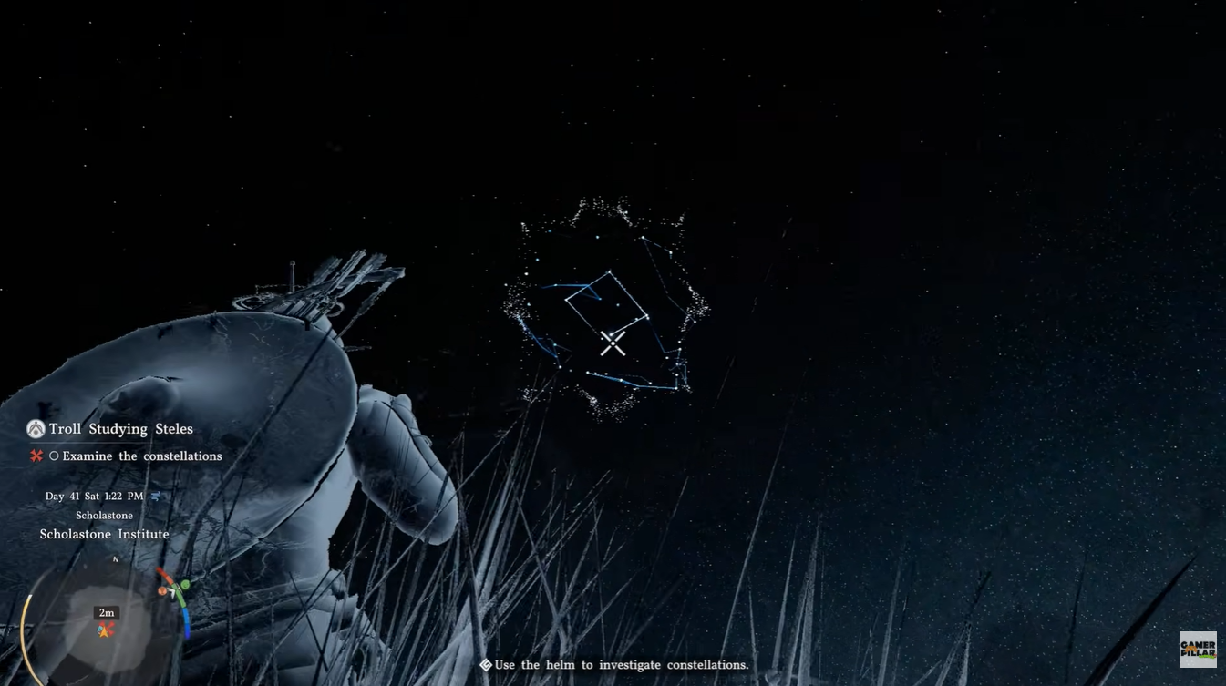 To begin examining constellations, you must first acquire the Constellation Helm. This is done by speaking to the NPC positioned near the stone during the quest. After the interaction, the helm becomes available for use.