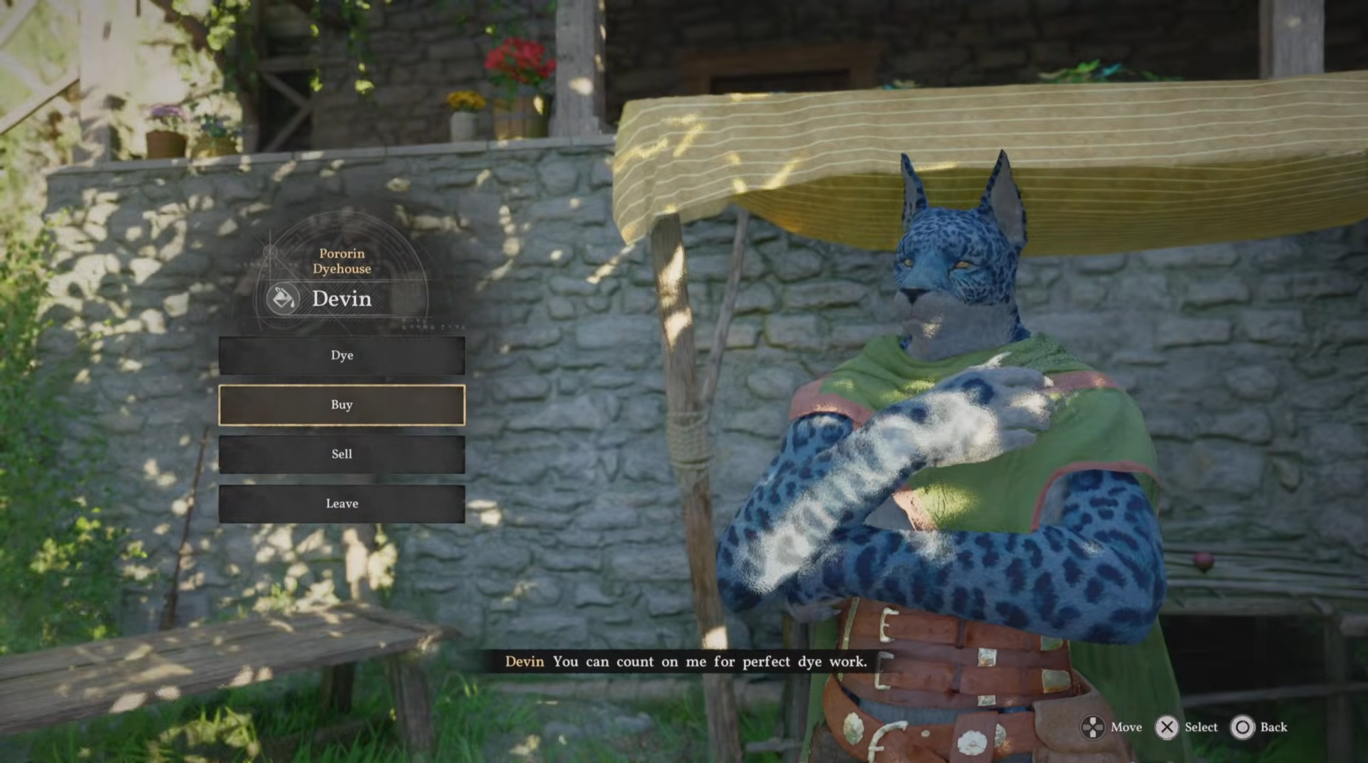 Interact with vendor Devin (cat-man merchant north side of main area).