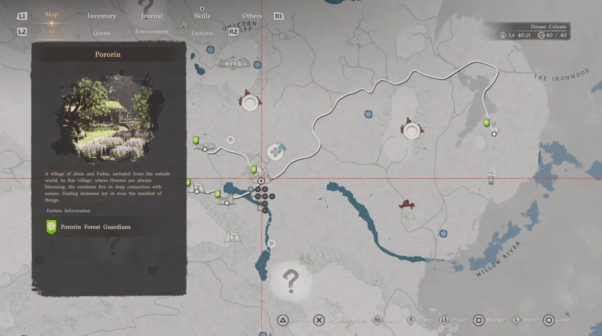 Pororin Forest lies southeast of Hernand Town in a dense, guarded woodland area east of Emberwind Workshop, featuring the hidden Pororin Village with Petalton Workshop on its central map point for arrow crafting and dye theft.