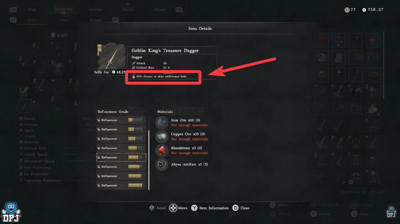 While the combat stats help you handle early enemies, the passive effect is what defines the dagger. Over time, this 10% bonus can result in dozens or even hundreds of extra hides, especially if you frequently hunt animals.
