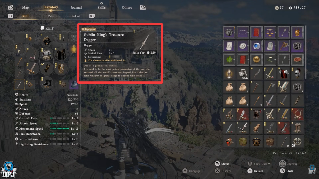 The Goblin King’s Treasure Dagger stands out because of its passive farming bonus rather than raw combat power. While the attack and critical stats are decent for early gameplay, the real advantage lies in its 10% chance to skin additional hide, which stacks over time and becomes incredibly impactful.