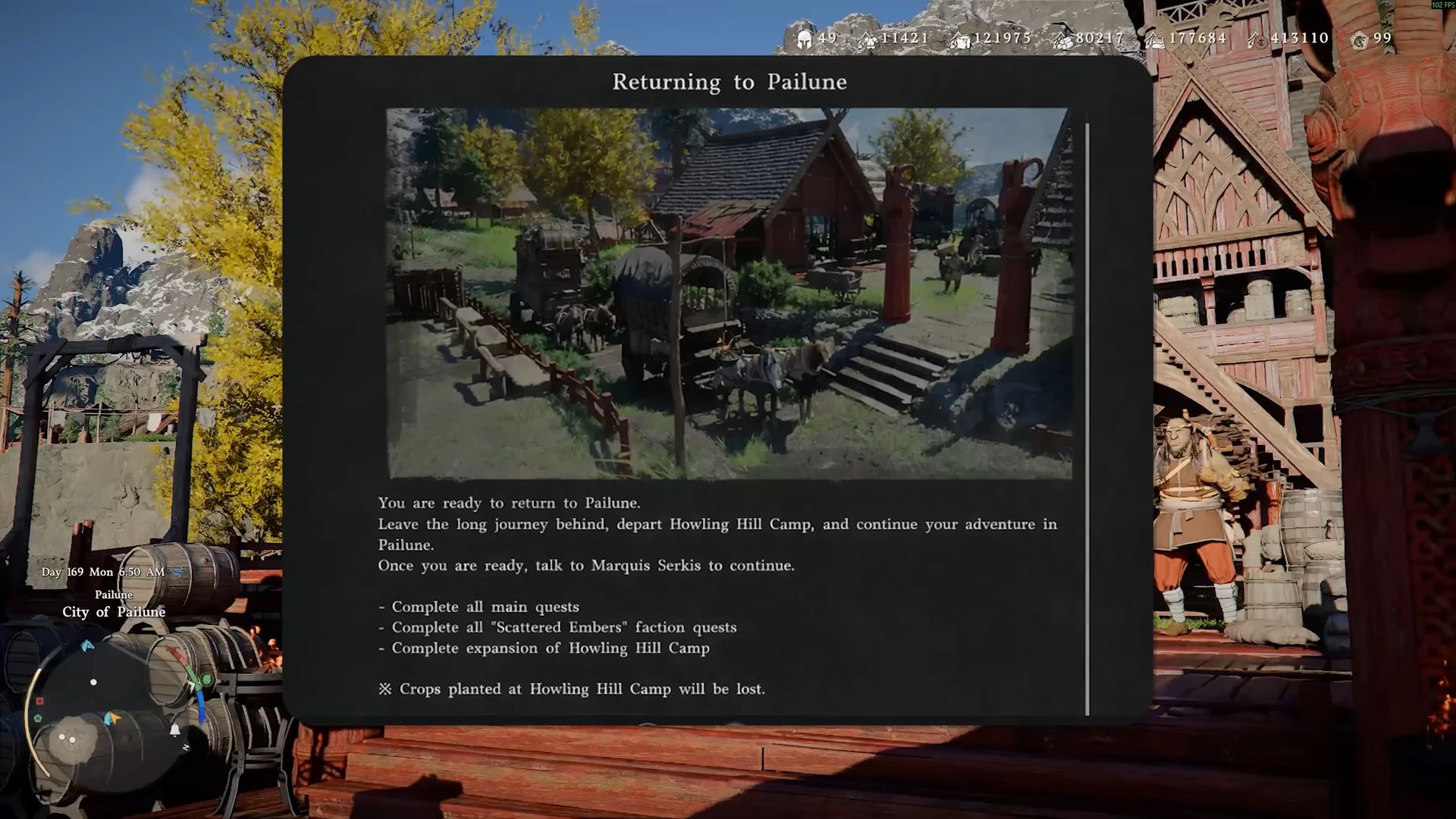 - Moving to Pailune is the final camp upgrade and requires full main story progress, all Scattered Embers quests, and a fully upgraded Howling Hills camp.