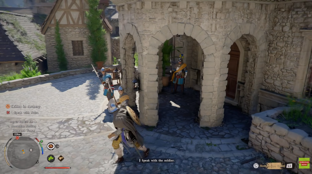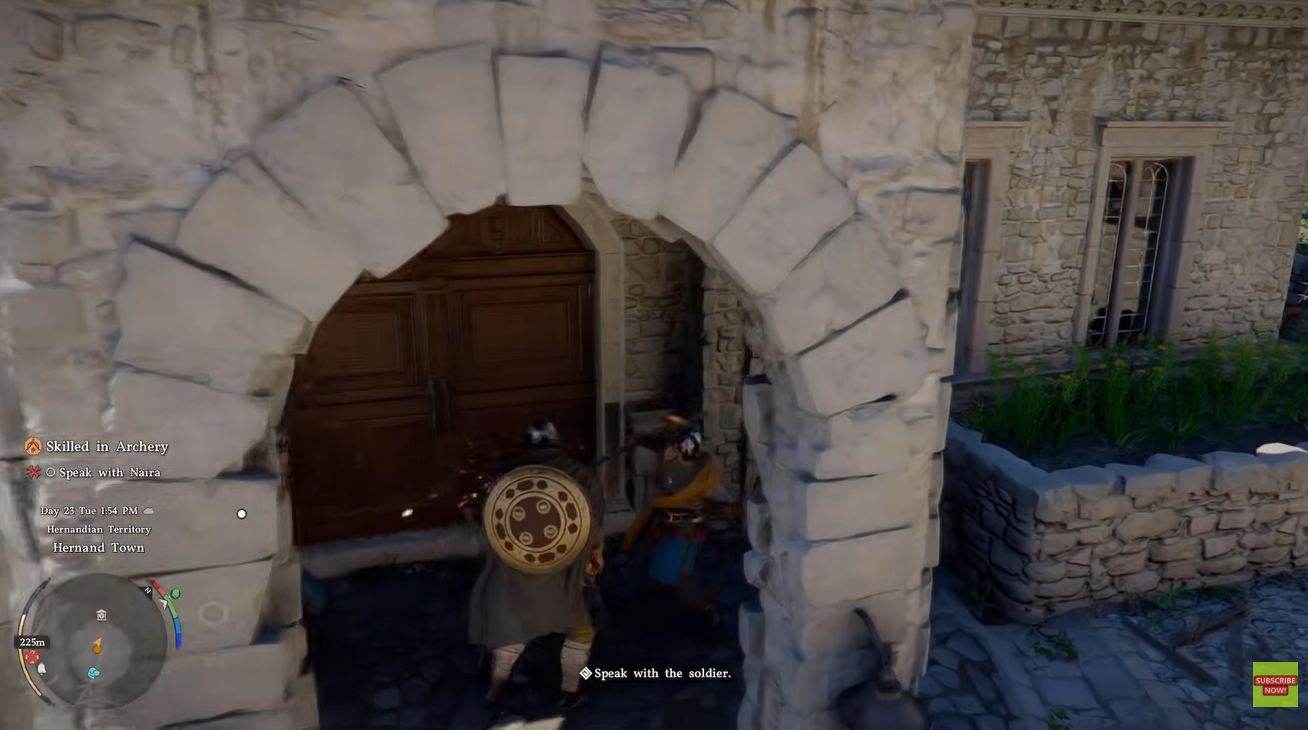 Approach the entrance and interact with the guard blocking your path. This is where the process officially begins.