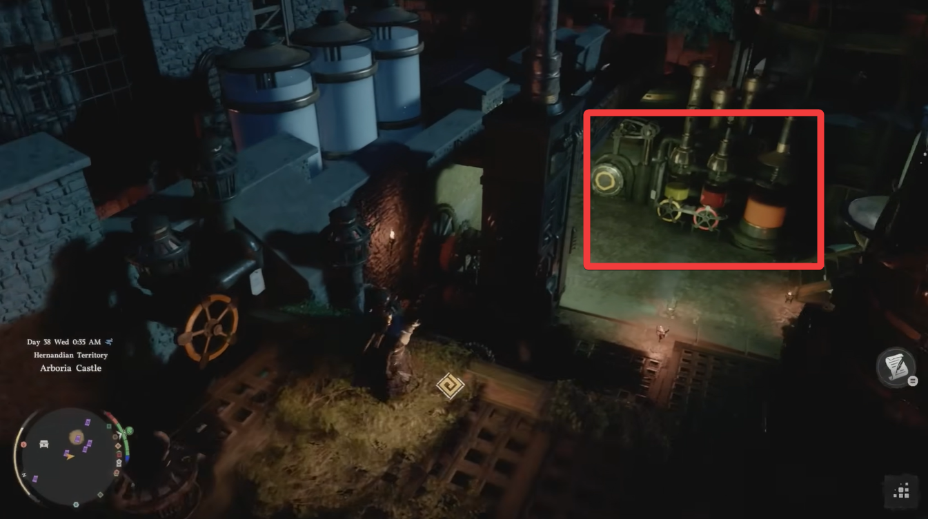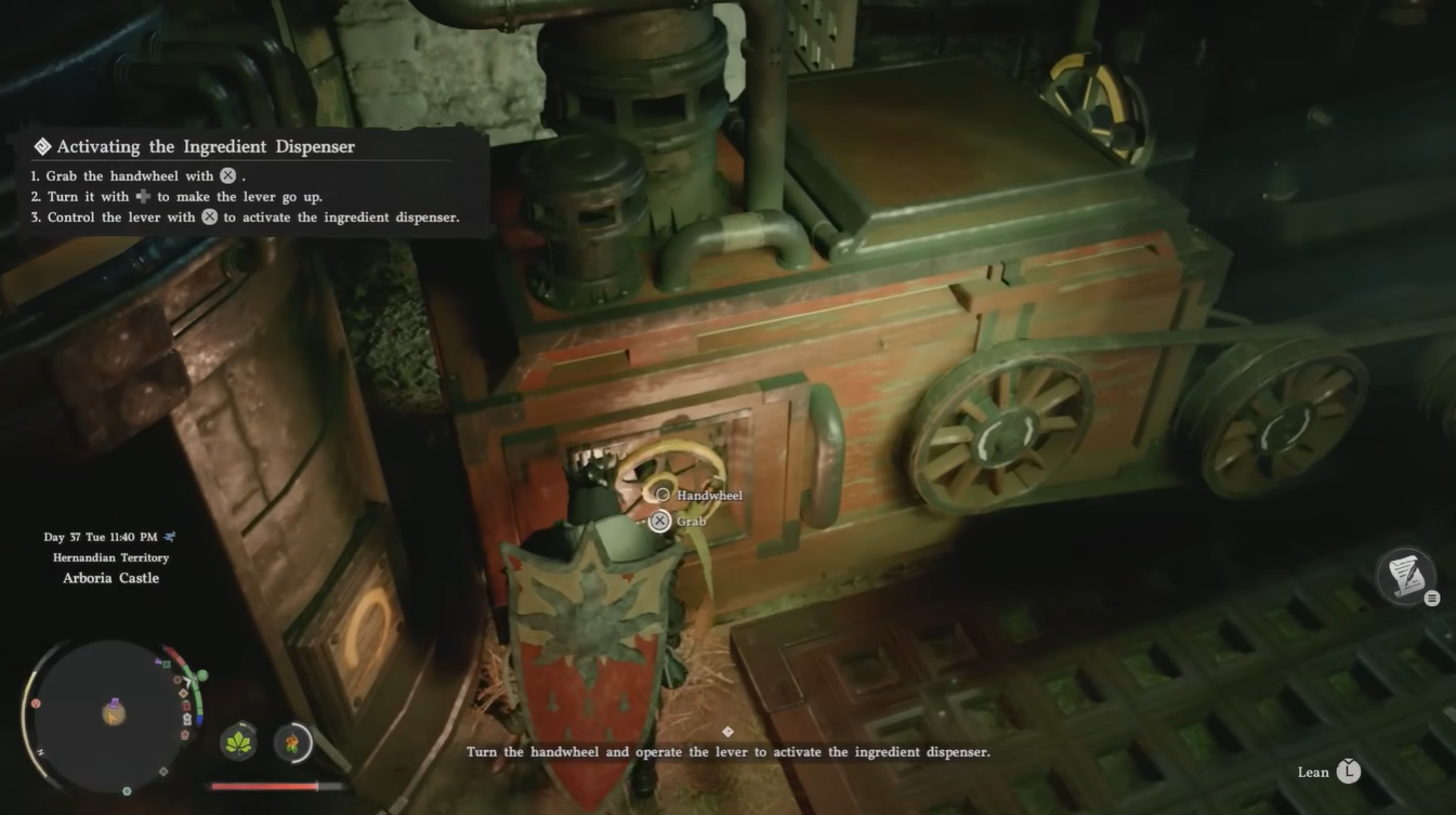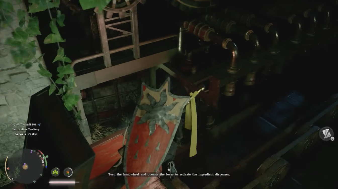 Climb upward toward the yellow wheel structure. Interact with it to activate the fertilizer spray system, which is required for later stages of the quest.