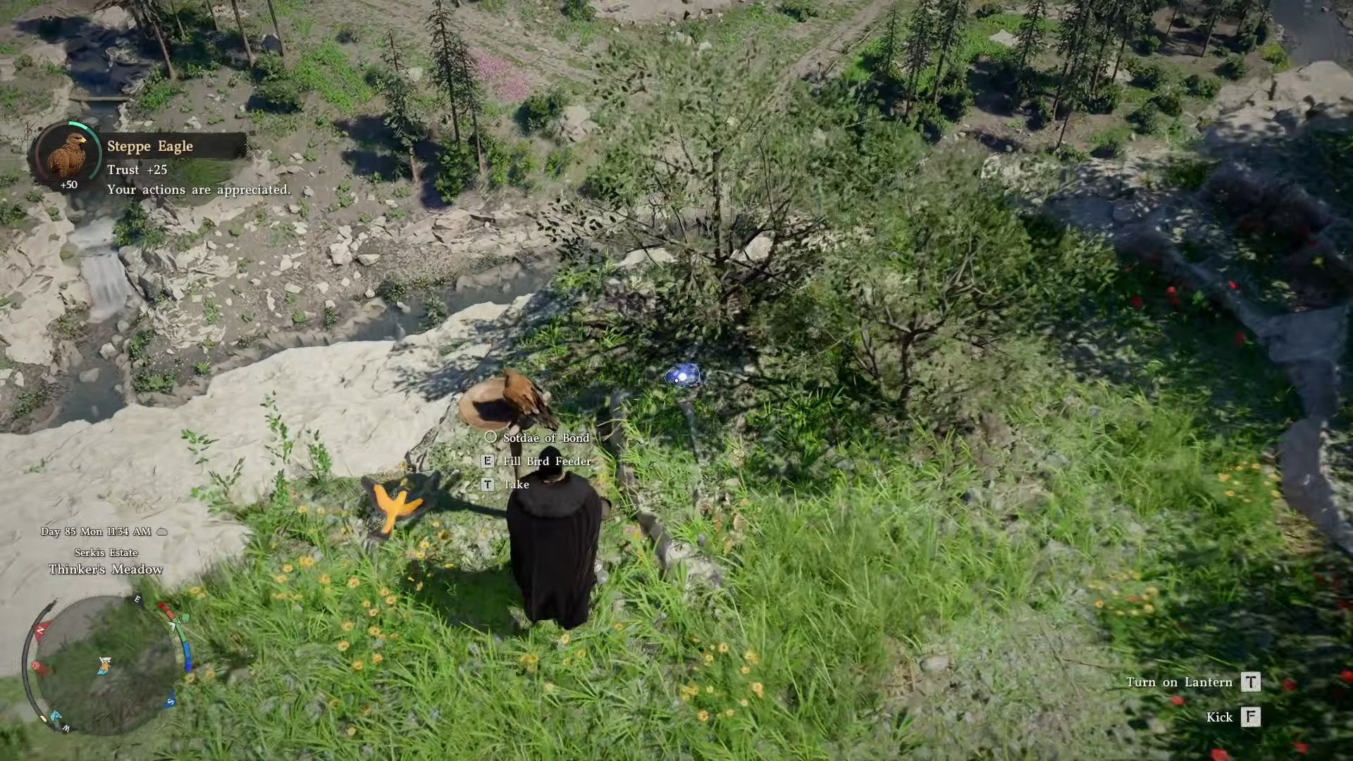 Birds land automatically based on food type and location; each bite builds +25 trust passively—no need to stay nearby.