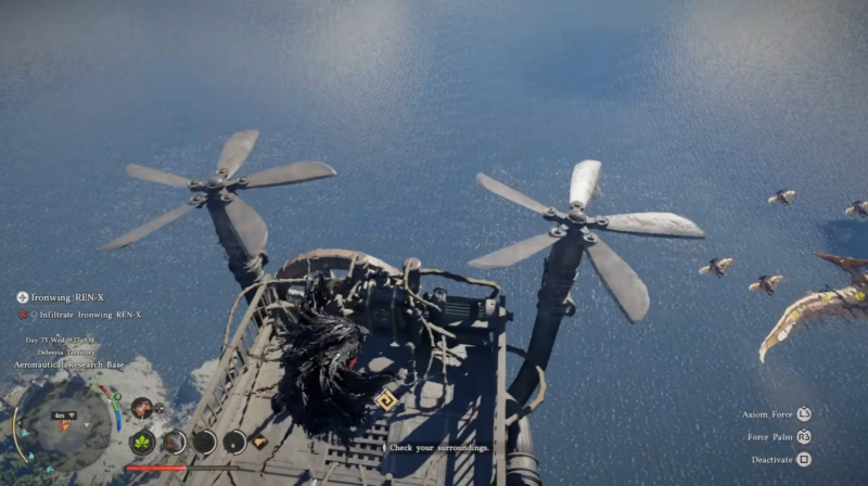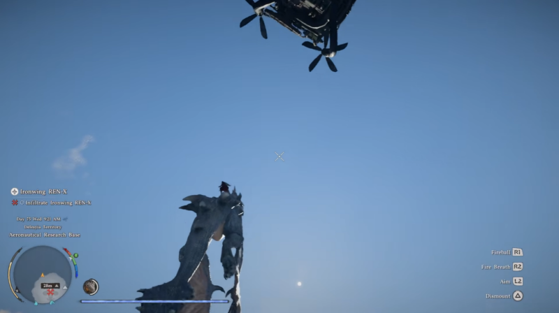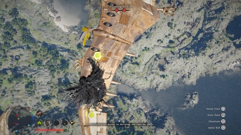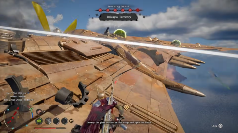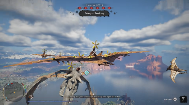 There are two primary ways to reach Ironwing REN-X, and your choice depends on your progression level. If you’ve unlocked the dragon mount around Chapter 11, you can directly fly up to the airship. This method is the most straightforward, but it comes with a limitation: the dragon has a long cooldown of roughly 50 minutes, so failed attempts can be costly.