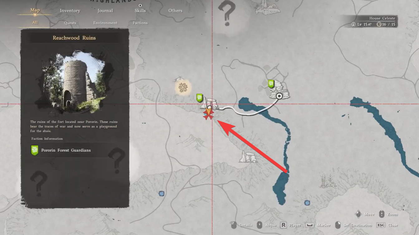 Travel toward Reachwood Ruins located southeast of Hernand. Use the map markers around Porin Village as your directional guide.