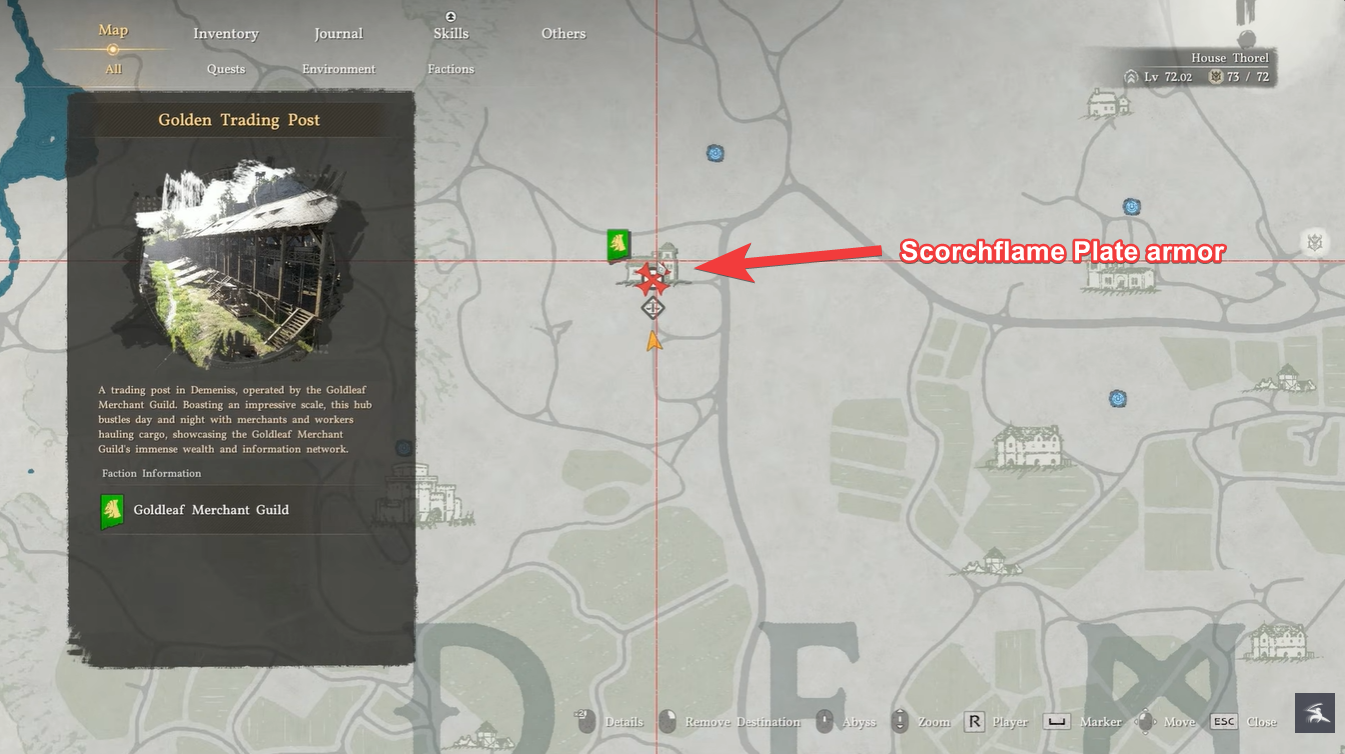 Travel to the Golden Trading Post and locate the hidden trap door. You will need to crouch to access the area where the chest containing the Scorch Flame Plate Armor is stored.