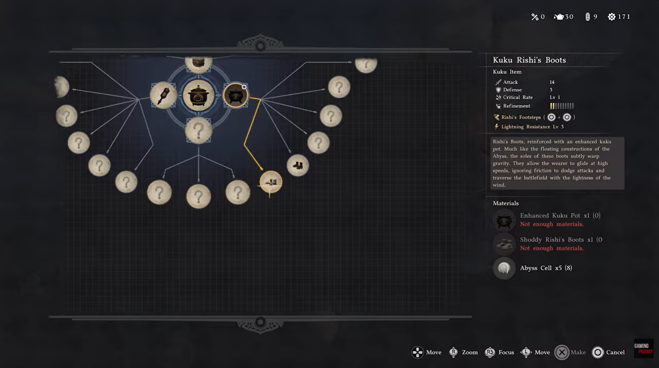 Craft the Enhanced Kuku Pot first using its required materials. Use the Enhanced Kuku Pot, Shoddy Rishi’s Boots, and Abyssal Cells to craft the final boots.