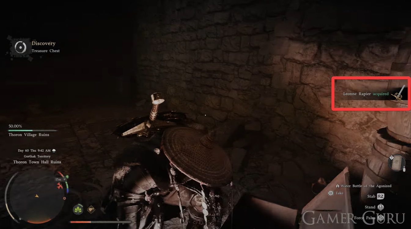 The Leonne Rapier is located in Thoron Town Hall Ruins, a quiet but dangerous area in the Gorthak region north of Delesyia. As you approach the ruins, you will notice multiple collapsed structures and pathways that branch out from the central area.