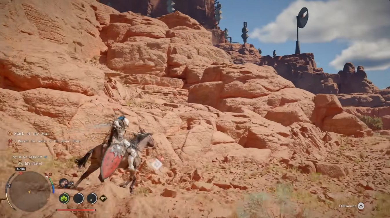 You should ride your horse as far as possible toward the stone city, using open terrain to your advantage. Eventually, you’ll encounter a secondary gem mine, which serves as a natural stopping point. Beyond this, continuing on horseback becomes inefficient and risky, so transitioning to on-foot traversal is the smarter choice.