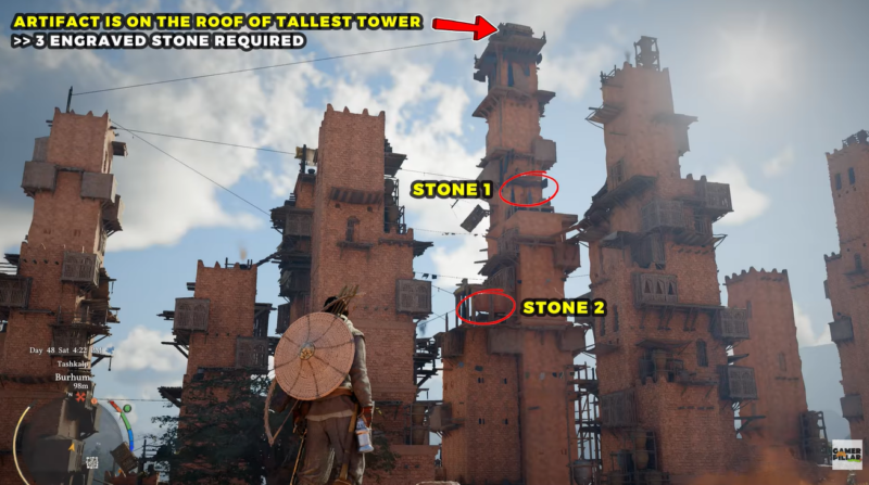 The puzzle revolves around three Engraved Stones, and their placement across towers is intentionally deceptive. Two are located within the same main tower, while the third forces you to explore a separate structure.