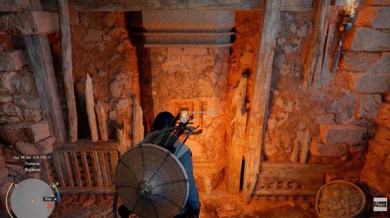 Near a hay bed on this level, you’ll find Engraved Stone 2. It’s placed in plain sight compared to the first stone but still easy to overlook if you don’t explore thoroughly.