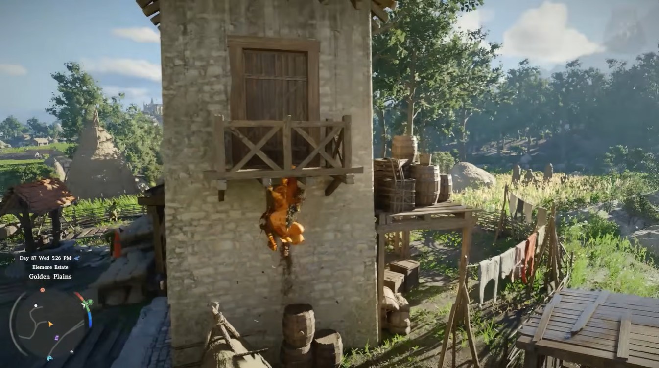 The boots are not openly visible, so you must explore vertically rather than just scanning the ground level. The key landmark is a short white tower with a blue roof, which stands out against the plains environment. Once you locate this structure, your goal is to reach its first floor using climbing mechanics.