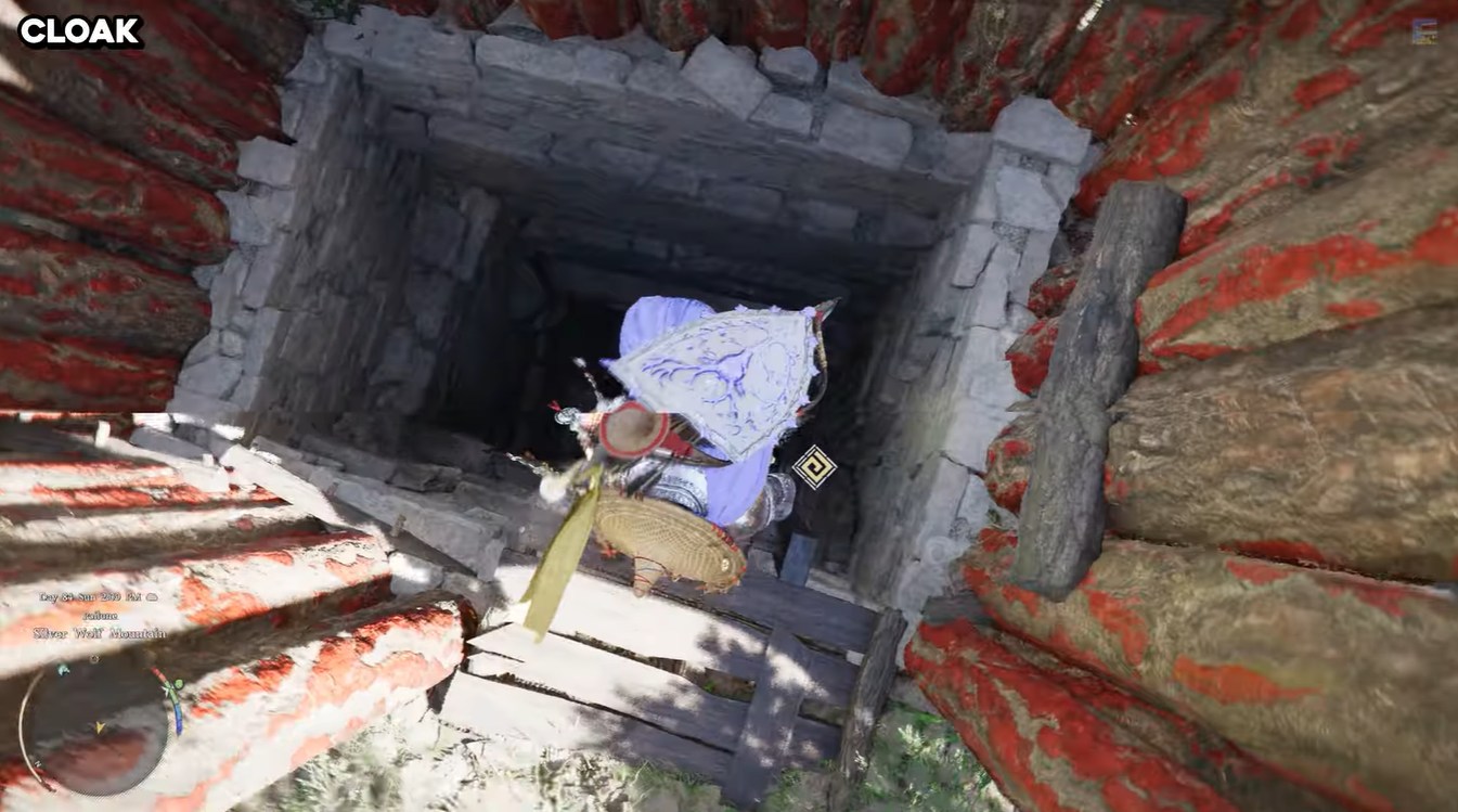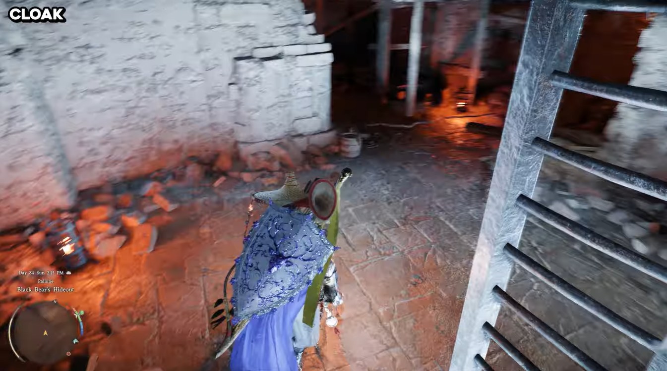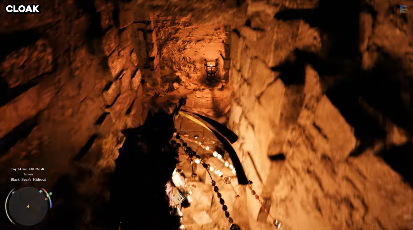Descend to the lowest level of the hideout, navigating scaffolding and narrow paths.