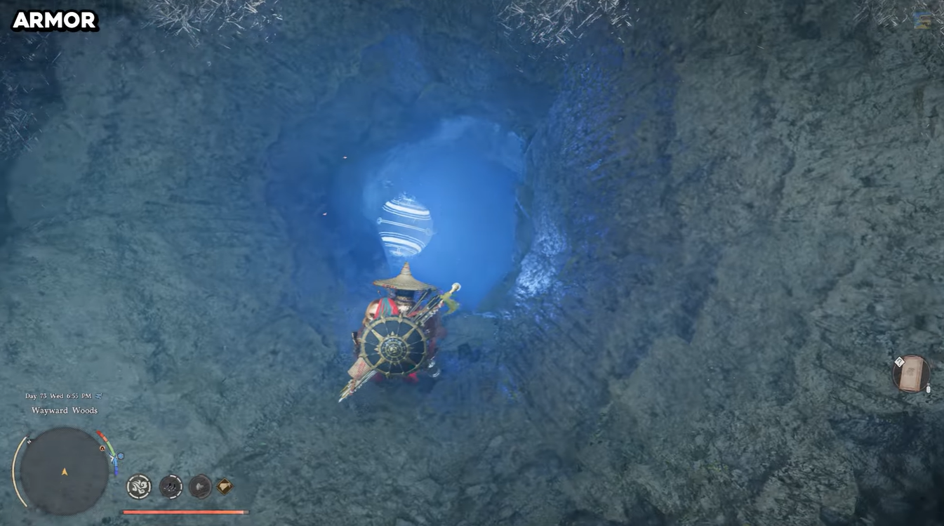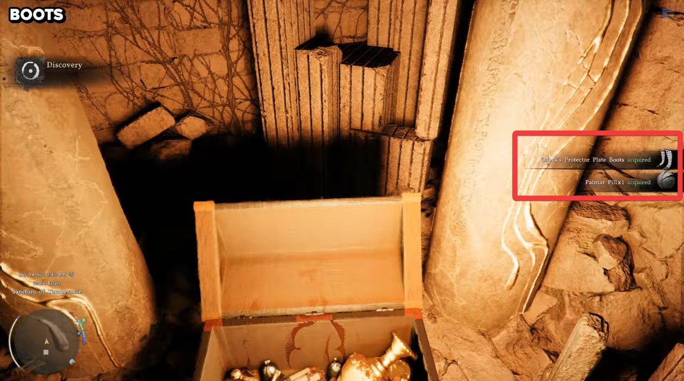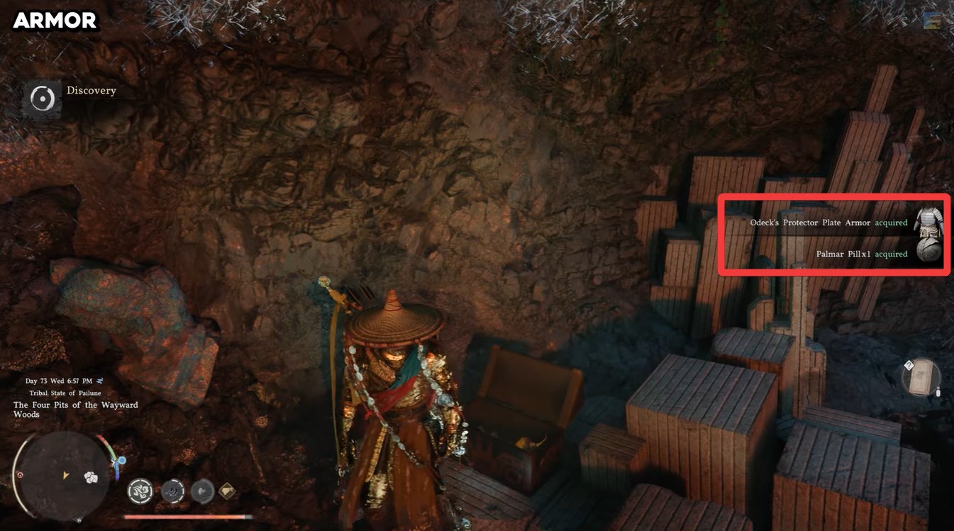 Enter the hidden area and explore until you find a treasure chest. Inside, you will receive the armor piece along with a Palmar Pill and Copper Ore.