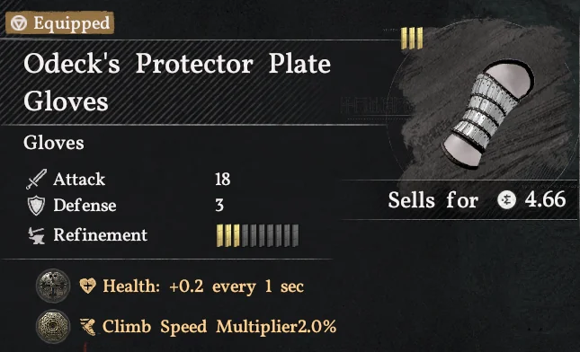 The boots and gloves, in particular, offer noticeable gameplay improvements, especially when climbing or navigating difficult terrain. Meanwhile, the armor and helm provide solid defensive scaling for mid-game encounters.