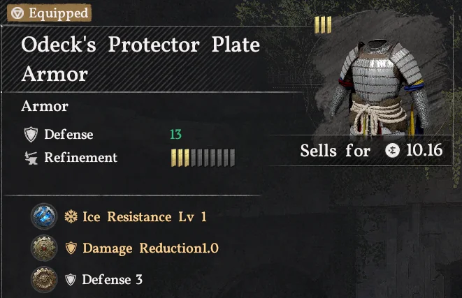 | Effects | Ice Resistance Lv 1, Damage Reduction 1.0, Defense +3 |