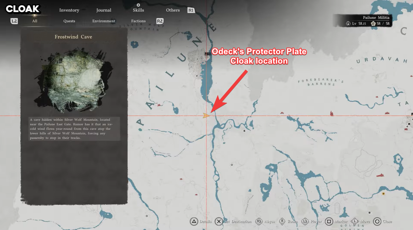 Location of Odeck’s Protector Plate Cloak: Near the Frostwind Cave in Silverwolf Mountain area, inside the Black Bear Hideout. The cloak stands apart as a lore-heavy item with situational use rather than raw stats.