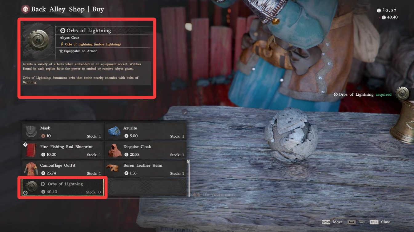 You can purchase Orbs of Lightning Abyss Gear at Back Alley Shop near the Port area of Pailune’s canal for 40.40 silver, from NPC Randolph. Randolph’s shop is deliberately tucked away in a less obvious part of Pailune, making it easy to miss even if you are tracking it on the map.