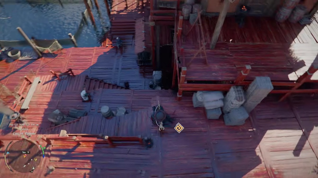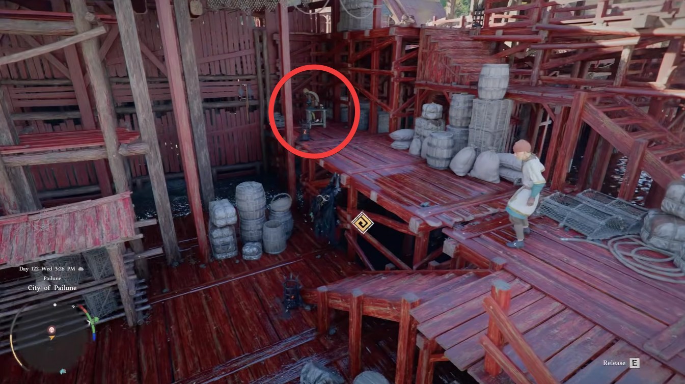 You will need to head into the Port area of Pailune, where the environment becomes denser with structures and NPC activity. Look specifically for a cluster of red taverns, as this serves as your main landmark.