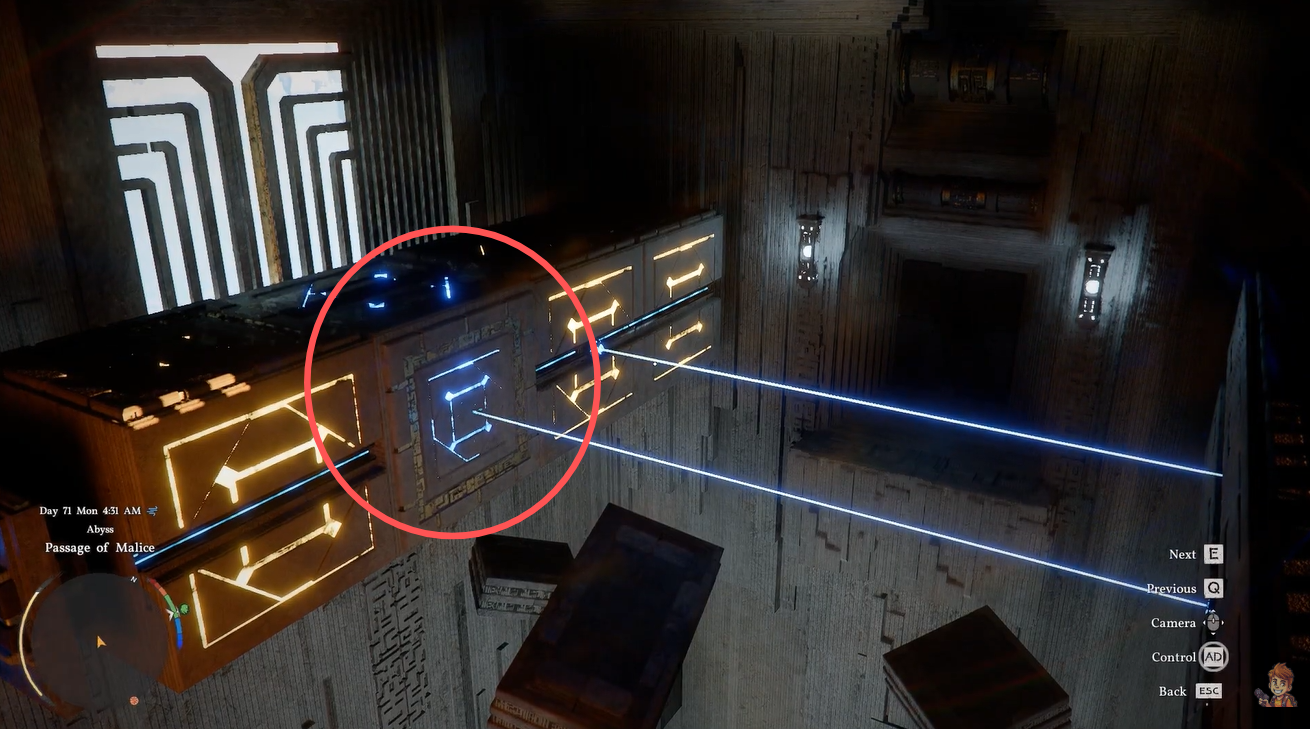 - Laser alignment between block segments is the key to unlocking the central gate.