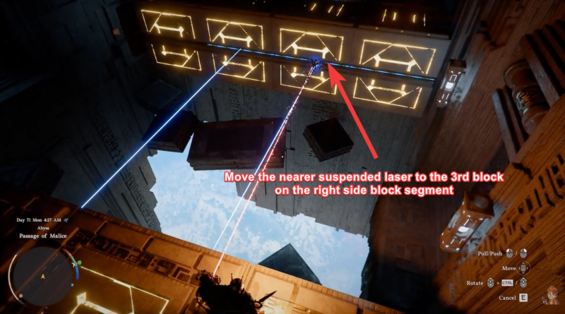 From here, move the suspended laser from the 4th block to the 3rd block on the right segment. This begins the synchronization process.