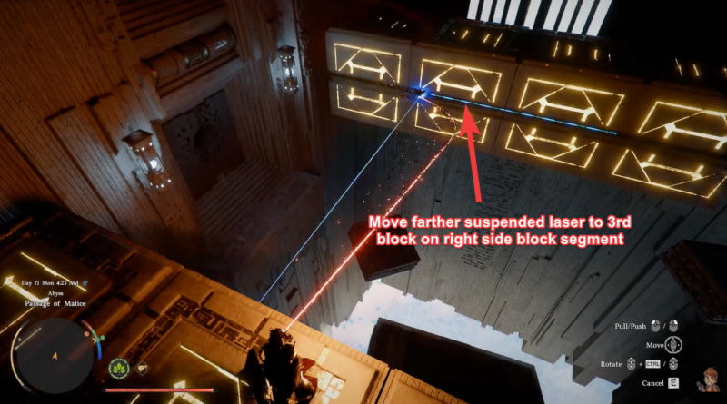 The Passage of Malice area is divided into two mirrored block segments on the left and right, with a central locked gate between them. Each side contains rotatable blocks and suspended laser nodes, which must be aligned symmetrically. Below the entry point lies the main puzzle arena, accessed after activating the first Axiom device.