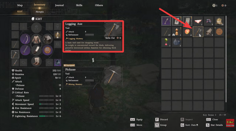 - How to equip pickaxe and logging axe properly