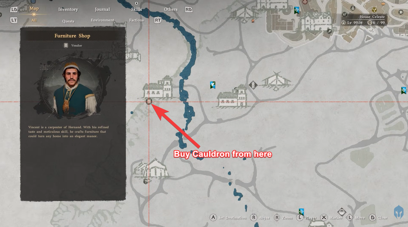The most reliable option is to buy your own Cauldron, which gives you permanent access and flexibility. You can purchase one at the Timberham Sawmill, located southwest of the starting city in Hernand, from the furniture salesman. However, it costs around 40 silver, making it a relatively expensive early investment. Still, owning one allows you to place it at your home and craft anytime, which is the most convenient setup long-term.