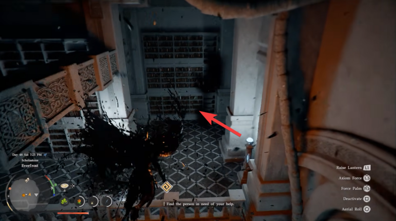 Once you land near the shelves, your focus should shift to the lower section of the bookshelf.