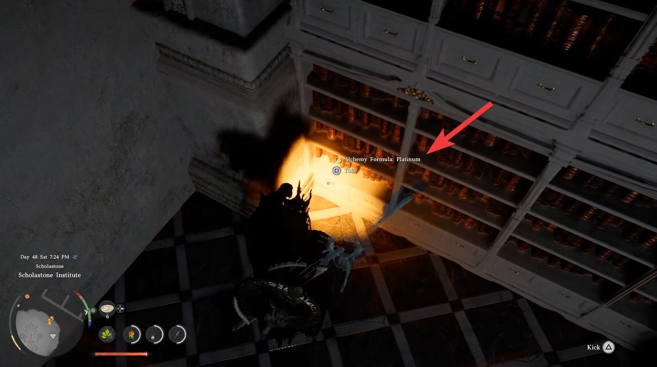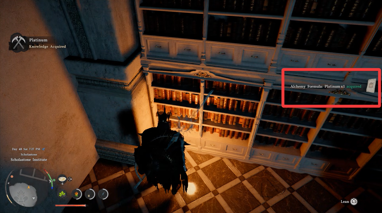 The Platinum recipe is hidden inside the Scholastone Institute, specifically within the library section of the main building. Once you enter through the main gate, you’ll want to head straight into the library area. As soon as you step inside, orient yourself toward the right-hand side, where you’ll notice a first-floor galleria (balcony-like section).