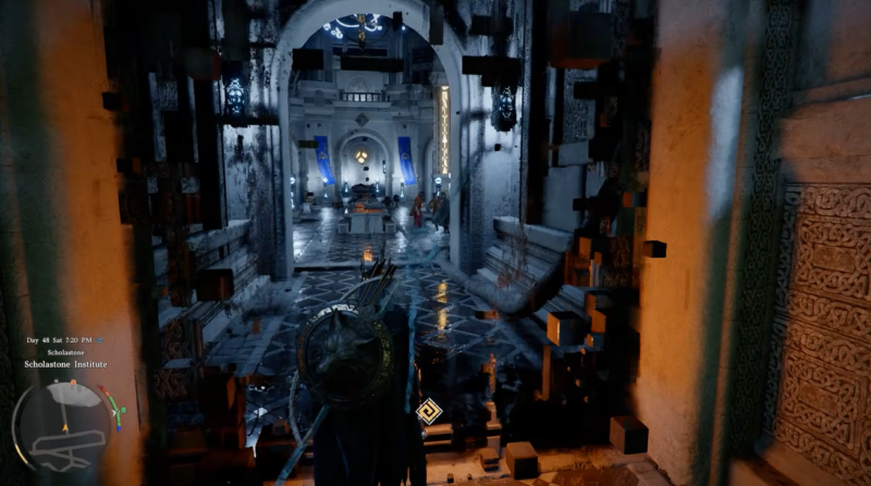 Enter the Scholastone Institute through the main gate and proceed directly inside the main building. Stay focused on reaching the library section without getting distracted by side rooms.
